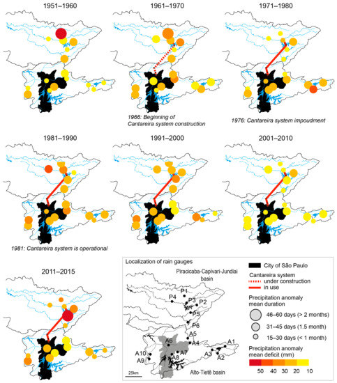 According to Figure 6, the length and deficit volumes of precipitation volumes are homogeneous through time over both basins. With regard to the Alto-Tietê basin, precipitation anomalies last on average between 28 and 40 days and the mean deficit volume vary between 16 mm and 30 mm. Considering the headwaters of the PCJ basin, precipitation anomalies last on average between 27 and 43 days and the mean deficit volume vary between 16 mm and 35 mm. Nonetheless, it can be seen that the precipitation anomalies of the 2001–2010 decade had the lowest deficit volumes (less than 16.5 mm) on average in both catchments. Finally, still from Figure 6, it can be underlined that precipitation anomalies of the 2011–2015 period lasted for a longer period in the Alto-Tietê basin than in the headwaters of the PCJ basin, although the difference remains small (31.5 and 29 days on average, respectively). Volume deficits were nonetheless larger in the headwaters of the PCJ basin than in the Alto-Tietê basin: 34.5 mm and 21.9 mm on average, respectively. Finally, it can be noted that P5, situated close to the Jacarei reservoir, recorded the longest and driest precipitation anomalies during this period (mean duration of 51 days and mean volume deficit of 65.6 mm; Figure 6).