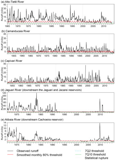 Finally, runoff anomalies were difficult to analyze for the Jaguari and Atibaia rivers, on one hand because of a significant number of gaps in the dataset (Figure 2), and on the other hand because they have been implemented downstream the main reservoirs that compose the Cantareira system. Runoff values are hence influenced and depend on management options considered by SABESP. Nonetheless, it can still be observed that runoff values are below the 7Q2 value from November 2011 for the Jaguari River, downstream the Jaguari and Jacarei reservoirs (first reservoirs of the Cantareira system; Figure 7d), and from September 2014 for the Atibaia River, downstream the Atibainha reservoir (fourth reservoir of the system; Figure 7e). In addition, such low runoff values downstream these reservoirs were already observed between January 2002 and September 2009 for the former, and between January 2002 and August 2006 for the latter (Figure 7d,e).