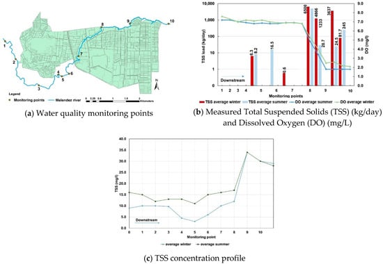 Figure 2a depicts the geographical location of the monitoring points. Point 1 was selected as a reference point in order to determine the status of the water quality of the river before it reaches the urban area. Two stations were taken into account in the rural area (i.e., points 2 and 3) with the purpose of evaluating the impact from coal mines. In total, 10 monitoring points were monitored to evaluate the water quality of the river. The maximum daily Total Suspended Solids (TSS) measured was approximately 6500 kg/day and a minimum Dissolved Oxygen (DO) of 2 mg/L (see Figure 2b).
