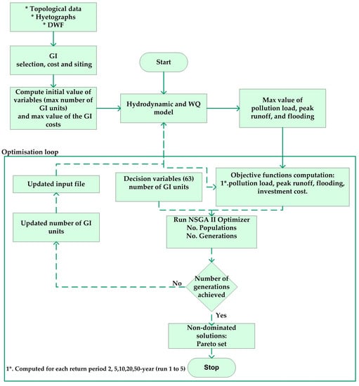 The optimisation procedure consists of adjusting the number of GI units, taking into account their location within the catchment area. For this purpose, the NSGA-II optimiser algorithm that was developed by [] was used with the goal of finding a representative set of optimal Pareto solutions and to quantify the trade-offs between pollution load, peak runoff, flood volume, and investment cost. Figure 3 illustrates the proposed optimisation procedure. The optimisation steps include: (1) computation of the initial value of variables, in this case, the maximum number of GI units and its maximum costs, (2) the initial simulation of the hydraulic and quality model, (3) computation of the maximum values of pollution load, peak runoff, and flooding volume for different return periods of rainfall, (4) computation of the objective functions, (5) running the optimiser NSGA-II according to the number of populations and generations, and (6) updating the hydrodynamic input file by changing the number of equal size units of the GI (e.g., the number of bio-retention cells) deployed in each subcatchment if the number of populations and generations has not been reached.