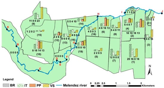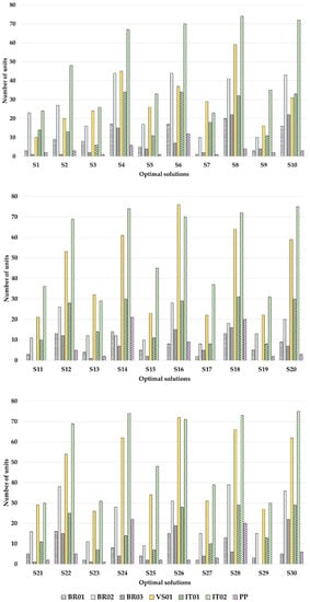 Solutions s-2 and s-10 indicate an important pollution decrease, especially where the water quality deterioration in points G, H, I, and J of the Meléndez catchment is very significant. Solution s-12 and solution s-20 are able to regulate the flow of the river when a rainfall event occurs in the upper part of the catchment (points A, B, and C), and thus reduce the river flow at the entrance of the city (between points G and H). Solution s-22 and solution s-30 indicate the possibility of reducing the risk of flooding, particularly in points H and I where the highest flood volumes occur in a mostly residential area. Figure 6 presents the optimal number of units with the aim of identifying the GI type that better reduce the three objectives for the study area.
