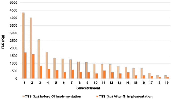 Potential suitable location/areas for different types of GI were identified from the analysis of urban land use, stream location, soil classification, land ownership, and impervious layers. The placement of GIs was carried out by finding the available space for GI in each subcatchment. The minimum percentage of available area (ha) was found to be 2.8% and the maximum 32%. Figure 4 presents the maximum number of GI units for each subcatchment. With the criteria presented in Section 3.2.2, the maximum number of GI units found was 468 divided, as follows: 116 units of BR, 116 units of IT, 164 units of vs. and 72 units of PP. Figure 5 depicts an example of the TSS loading in each subcatchment for a five-year return period event before and after GI placement (applying the maximum number of units). On average, a reduction of 40% of TSS could be potentially obtained after implementing GI measures.