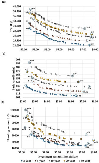 Figure 6a shows that for smaller events, with solution s-2 an investment of $7.5 million can achieve a pollution load reduction of 43%. For larger return period events (up to 50 years) a $7 million investment suggests a pollution load reduction of 40% (solution s-10). In terms of peak runoff reduction, Figure 6b presents solution s-12 with a peak runoff reduction of 30% by investing $6.4 million for a two-year event. With solution s-20 it is possible to reduce peak runoff by 27% for a 50-year event and $6 million investment. Figure 6c presents optimal solutions for flood volume reduction. Solution s-22 shows a reduction level of 80% for a two-year event with an investment cost of $7.3 million. Solution s-30 demonstrates a flooding volume reduction of 68% by investing $7.4 million (up to 50 years).