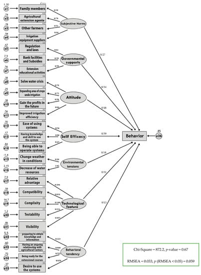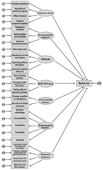 35] and its positive and significant relationship has been confirmed. This relationship has also been studied in this research, and its positive and significant relationship has been reaffirmed. In addition, it was found that among variables such as other farmers, agricultural extension agents, irrigation equipment suppliers, and family members, agricultural extension agents have a greater impact on farmers’ behavior. This issue proves the importance of the role of agricultural extension agents in helping to develop the agricultural sector.