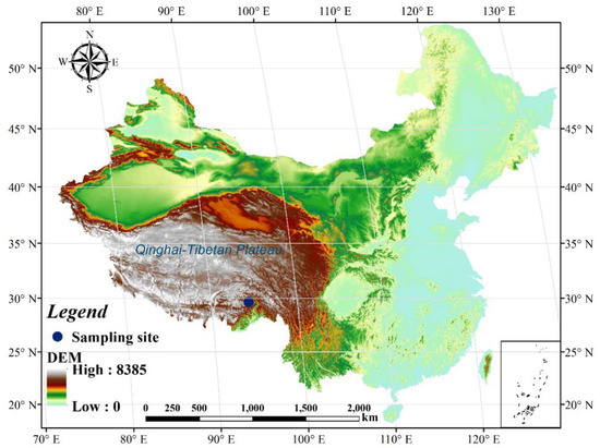 The experimental site is located in Milin County (93°25′ E, 29°50′ N, 2900 m a.s.l.) near Nyingchi City in the Tibet Autonomous Region, Southwestern China (Figure 1). This region belongs to the alpine area and has a typical sub-alpine, temperate, semi-humid, monsoon climate with an average annual temperature of 8.2 °C. The average temperature of the coldest month (January) is −14.0 °C, while the average temperature of the hottest month (July) is 19.2 °C. The annual precipitation is ca. 641 mm year−1, with 85% of the rainfall occurring from June till September. The average annual frost-free period is 170 days and the annual total solar radiation ranges from 5460 to 7530 MJ m−2 in Milin. The forest ecosystem of Nyingchi City is relatively complete from south to north, and comprises several species such as Picea abies, Cupressus funebris and Rhododendron simsii. The soil type in this area is leached cinnamon soil which is young in origin and does not exhibit different soil horizons. The contents of silt, clay and sand are 17.2%, 23.5% and 59.3% respectively in the soil surface layer and the pH value is 6.7.