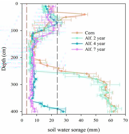 Soil water storage in the cornfield and in the two-, four- and seven-year-old alfalfa pastures in the 0–400 cm soil layers at 10 cm intervals. The black dotted line indicates the soil water content at field capacity. The red dotted line indicates the soil water content at permanent wilting point.