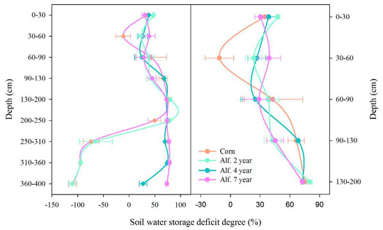 The soil water storage deficit (Da) in the cornfield was greatest at the depth range of 130–200 cm (75.2%), then decreased with increasing soil depth and was lower than in the three alfalfa pastures below a soil depth of 200 cm. The greatest Da was observed at the depth range of 130–250 cm (79.3%) in the two-year-old alfalfa pasture. However, the soil water storage degrees (DSW) of the four- and seven-year-old alfalfa pastures were higher than that of the two-year-old alfalfa pasture below the soil depth of 250 cm (Figure 3).