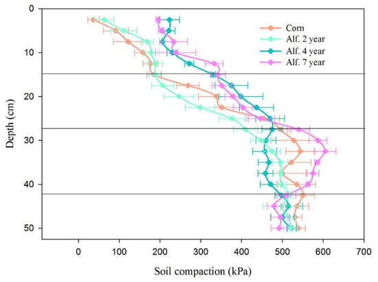 Soil compaction in the cornfield and the alfalfa pastures increased with the increase of soil depth in the 0–50 cm soil layers, but the increased speed gradually reduced below the 27.5 cm soil depth. The average soil compaction of the two-, four- and seven-year-old alfalfa pastures were approximately 15%, 90% and 100% higher than in the cornfield at the 0–15 cm soil depth. Soil compaction in the four- and seven-year-old alfalfa pastures was much higher than in the cornfield and the two-year-old alfalfa pasture at the depth range of 0–25 cm. The seven-year-old alfalfa pasture had the highest soil compaction values at the depth range of 25–40 cm compared with the other fields (Figure 4).