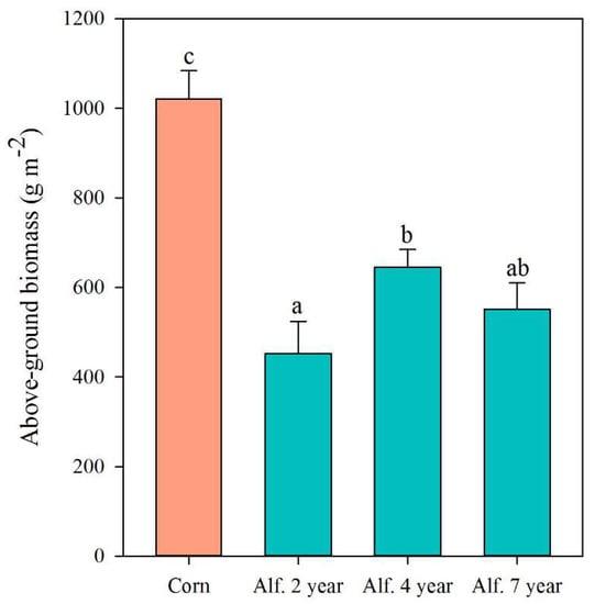 Above-ground biomass in the cornfield and in the two-, four- and seven-year-old alfalfa pastures. Different lowercase letters indicate statistically significant differences at the 0.05 level.
