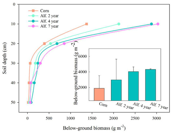 Vertical distribution of the below-ground biomass of the cornfield and the two-, four- and seven-year-old alfalfa pastures. The column chart on the right side shows the total below-ground biomass at 0–50 cm soil depth.