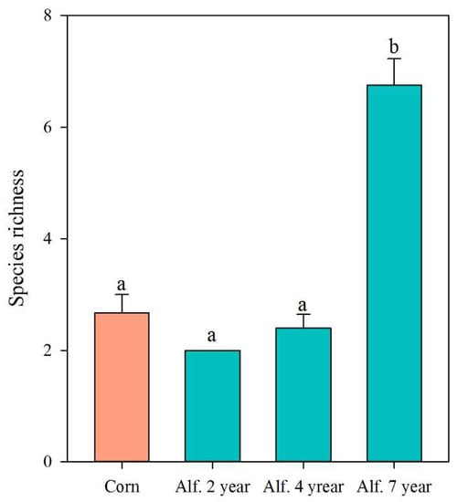 Species richness of the cornfield and the two-, four- and seven-year-old alfalfa pastures. Different lowercase letters indicate statistically significant differences at the 0.05 level.