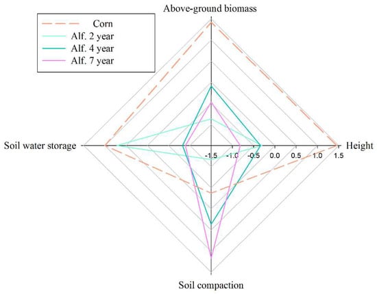 The above-ground biomass of the four-year-old alfalfa pasture, the soil water storage of the two-year-old alfalfa pasture, the soil compaction of the seven-year-old alfalfa pasture and the plant height of the two-year-old alfalfa pasture were the highest of all the pastures. Soil compaction of the two-year-old alfalfa pasture and the plant height of the seven-year-old alfalfa pasture were the lowest of all the pastures (Figure 8).