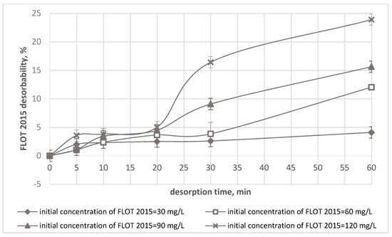 The experimental results shown in Figure 2 revealed that desorption increased with increasing desorption time for all initial concentrations of FLOT 2015. However, it is apparent that desorption was very limited for desorption times up to 20 min for all concentrations tested. Then, desorbability increased considerably when the retention time was extended up to 60 min and FLOT 2015 desorbed more readily from the mineral sample taken from the system with the highest initial concentration (120 mg/L).