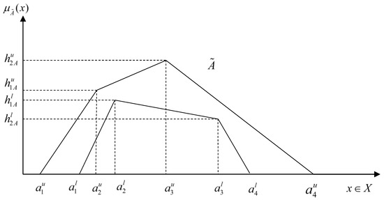 Pseudo-Interval T2 FSs play a central role in the models for their engineering applications [36]. They are a distinct type of FSs that can be described by a trapezoidal shape. Figure 1 shows the general interval T2 trapezoidal FSs. According to [37], the pseudo-interval T2 FS linear program can be described as