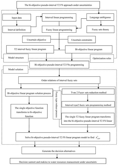 Although BOLP has a one-sided advantage of solving such problems with conflicting objectives, its single framework cannot entirely handle the uncertain coefficients present in the allocation process [23]. BOLP is incapable of mimicking the distribution of water resources under conditions such as floods, droughts, and other catastrophic situations. It also cannot determine the degree of effect of various uncertain factors on the water resource system. Moreover, water resource management is an uncertain, complex, and dynamic process. The existing BOLP model cannot reflect the degree of satisfaction of an objective function and the feasibility of the constraints. Therefore, comprehensive analysis of the uncertainty impact on the water resource system by mathematical methods, coupling with the development of uncertain coefficients—fuzzy or interval or stochastic—can effectively provide DMs with a reasonable water management schedule for sustainable social development. Even if the most basic water allocation system is employed, the seasonal fluctuations in the water resources will cause the program to utilize the uncertainty algorithms for completing the data processing process. For example, Vahdani [23] developed a bi-objective approach, which the embedded interval fuzzy possibilities chance-constraint method for demonstrating the applicability of BOLP in uncertainty. However, the solutions of the Vahdani method will generate numerous objective functions and constraints in the model, so that it will be very difficult to solve and understand the method.