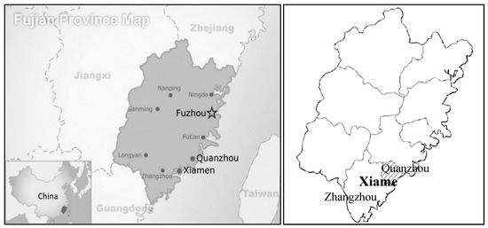 The annual water supply of the city is 63.073 million cubic meters, of which 59.342 million cubic meters comes from the largest surface water supply, accounting for 94.09% of the total water supply. The urban residents have the largest amount of water consumption, which is 181.57 million cubic meters, 28.79% of the total water consumption. The test results from the water quality monitoring site of the city show that the water quality of the drinking water sources and most of the important water bodies in the city is up to the standard. Except for a few, most of the river sections have been polluted to varying degrees. Figure 3 displays the location of Xiamen city in the Fujian province of China.