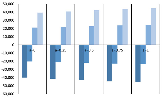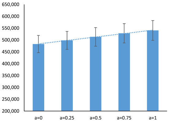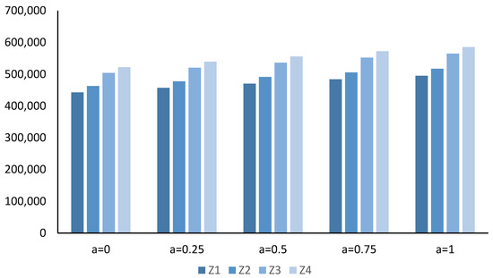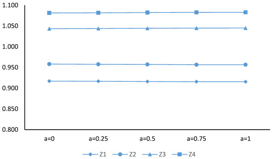 Table 4 lists the predicted entire advantages for each end-user of Xiamen city based on the application of the bi-objective pseudo interval T2 linear programming method with different acceptance degrees. The results exhibit that the total profit of water consumption is calculated to be (442,784, 462,602.6, 503,821.3, 522,116.7) × 106 CNY with acceptance degree = 0. At acceptance degree = 0.75, which is the most common case for FSs, the total profit is estimated as (483,695.5, 505,357.3, 552,043.6, 572,003.8) × 106 CNY for the next 15 years for Xiamen. Figure 4, which is plotted based on Table 4, shows that the higher acceptance degrees match the higher system profits, suggesting that the DMs could receive total profits that are dependent on the a degree. The result data apparently contain four points from Z1 to Z4, which correspond to four points of a single-interval T2 FS. The findings clearly show the advantage in relation to the real-world problem of water systems. The flexibility of the decision process is improved by the use of the interval T2 FS rather than using two interval boundaries. The comparison of the average and standard deviation of the acceptance degrees, which is illustrated in Figure 5 and Figure 6, exhibits the reliability and stability of the results of the optimal value. The results also indicate that the profit value can be closer to (491,303.5, 536,161.5) × 106 CNY with a lower limit of 470,247.9 × 106 CNY and upper limit of 555,563.4 × 106 CNY, for example, when the acceptance degree = 0.5. According to the analysis method of the effects of the uncertainty degree, the advantages presented in Figure 7 show that the lowest and highest uncertain degree that can contribute to an effective solution are less than 4.34% and no more than 8.29%, respectively. Correspondingly, the solutions demonstrate that the interval T2 FSs can really reflect the uncertainties.