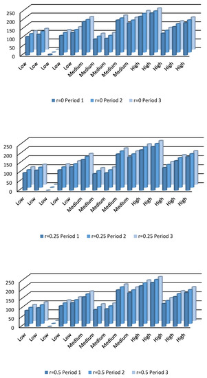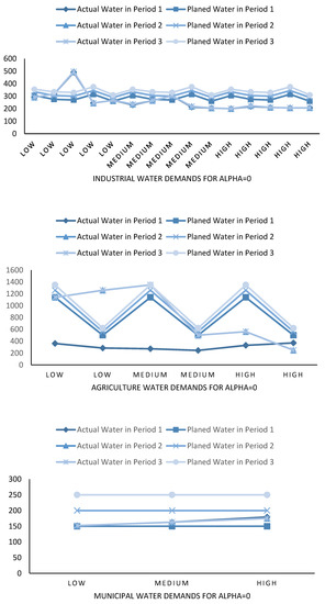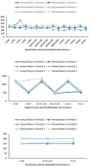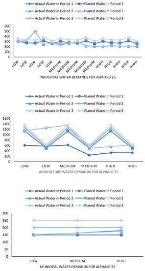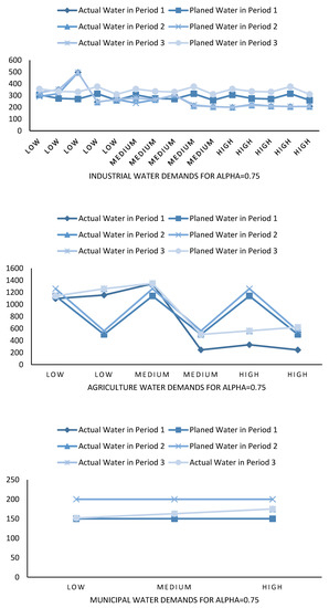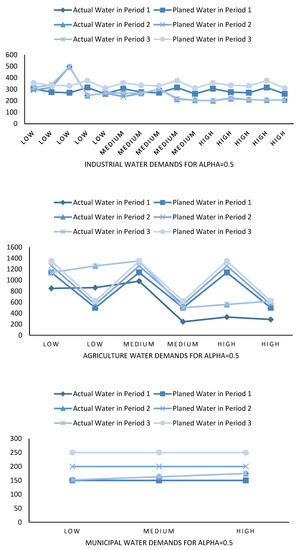 This study also discussed the effect of water shortage on each end-user at different acceptance degrees and water levels. The variations in water shortage are mostly caused by the water quality control, water treatment cost, and water level. Figure 9 as an example shows that the industrial users contribute the most to water shortage at each water level, particularly at a high-water level. This implies that although the industrial users are high-profit producers, they also encounter a high-water cost, and so, only reduce the water consumption to reduce the costs and increase the profits for each unit. The water that is planned for the industrial users is supplied to the agricultural and municipal users. Therefore, according to the modeling results, agricultural users have the least water in any period or at any acceptance degree. The agricultural users only face a shortage of water in period 1, but have a sufficient supply in periods 2 and 3. For the municipal users, the water shortage is 37 × 106 cubic meters and 75 × 106 cubic meters, which is common at medium and high water levels. However, at a low water-level, a municipal user is confronted with water shortage. This is because of the high cost of purchasing water from other cities. Additionally, major results of water shortage at the acceptance degree of 0.5 are presented in Table 6, which includes the water shortage for three types of users: industrial, agricultural, and municipal consumers. Compared with the other results at different acceptance degrees, the main difference is in the supply of water to the industrial users. Specifically, with a higher acceptance degree, a smaller quantity of water is supplied to the industrial users, except the machinery industry, which is accompanied by a large profit of water usage. This scenario is also consistent with the actual requirement of the local area.