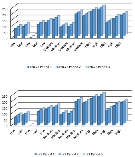 Table 5 lists the water supply quantity for industrial, agricultural, and municipal users at different acceptance degrees. The result shows the required water consumption, which is expected to significantly increase because of the rapid economic activities in the three five-year planning periods. From the perspective of the water level, when the water supply is high, there is a fluctuation in the water demand of the information technology industry in both periods 2 and 3. The water demand of the information technology industry is (223.1, 218, 218, 218, 218) × 106 cubic meters in the second five-year period, and it remains the same in the third five-year period. The results indicate that the DMs can achieve different optimal solutions by choosing different acceptance degrees according to their risk preference. The group of results indicates that such an industry has certain risk preferences for consuming water, which implies that the information technology factories face higher water treatment costs than other industries. This group of results also clarifies that the water volume remains at 223.1 × 106 cubic meters only in the case of zero acceptance degree; it is not constant at other acceptance degrees, including 0.25, 0.5, 0.75, and 1. This trend suggests that this category of industry requires the necessary wastewater treatment to significantly reduce the risk preferences.