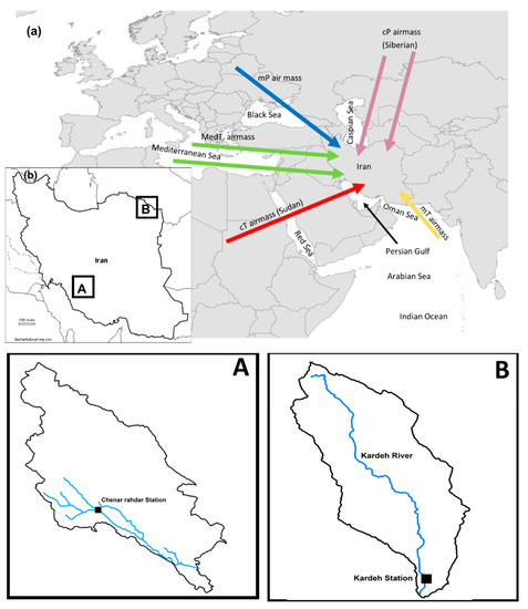 Extreme topographic anomalies, the Caspian Sea and the Persian Gulf water bodies, diverse air mass and moisture source influences and considerable area cause climate disparities across Iran. Two boxes, sized 1° × 1°, including Shiraz (A) and Mashhad (B) have been chosen in the south-central and northeastern parts of Iran, respectively (Figure 1). The Shiraz box in the south-central part and the Mashhad box in the northeastern part of Iran have been chosen as indicators to investigate the spatial climate variations across Iran. The Shiraz box is located in a synclinal plain of the Zagros Mountain range in Fars province in the south-central part of Iran. The climate of Shiraz box is semi-arid, with the average annual precipitation of 337 mm and long-term mean annual temperature of 18 °C. Chenar-rahdar River with a wide discharge range from 0.02 to 5.28 m3/s−1 and the discharge average of 0.75 m3/s−1 (measured in Chenar-rahdar gauge station) is the main river in the Shiraz box (Figure 1). The Mashhad box located in the northeast of Iran in Kopeh Dagh mega anticline is a semi-arid region with an average annual precipitation of 250 mm [43]. Kardeh River is one of the largest rivers in Khorasan Razavi province located in the Mashhad box with a discharge varying from 0.05 to 6.16 m3/s−1 and average discharge of 0.64 m3/s−1 (measured in Kardeh gauge station) (Figure 1).