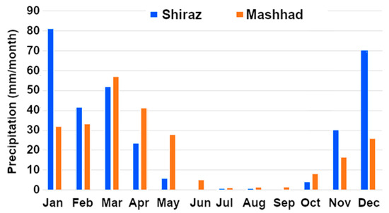 Monthly precipitation variations in Mashhad and Shiraz boxes based on 1981–2014 data derived from Iran Meteorological Organization.