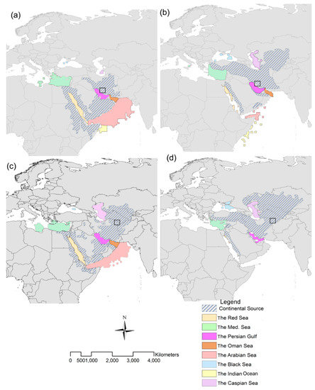 Main continental and marine moisture sources over the Shiraz and Mashhad boxes in the wet (a,c) and dry (b,d) periods, respectively, according to p95 percentile of (E − P) > 0 boundaries in Figure 2.