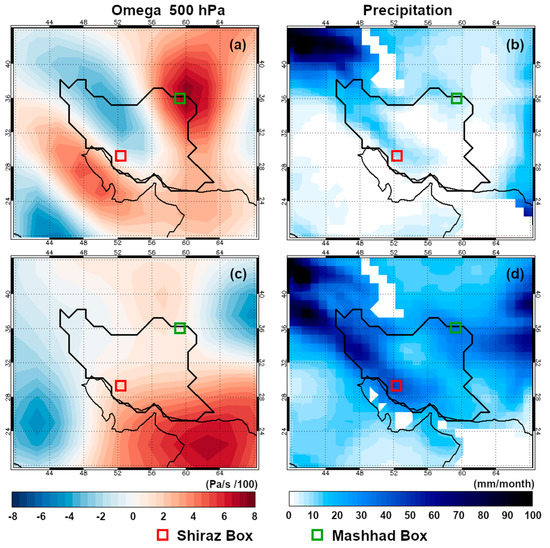 The stability of atmosphere (Omega ω) variations (a,c) and precipitation amount distribution (b,d) over Iran and nearby regions for the dry and wet periods, respectively (1981–2014).