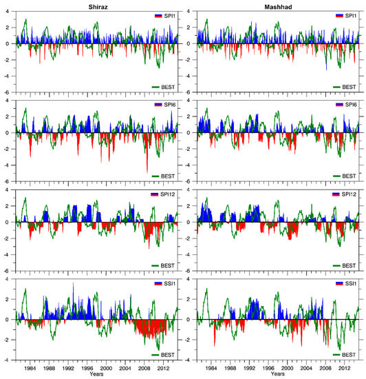 Temporal variations of 1-month, 6-month, and 12-month SPI and SSI with the variations of BEST in the Shiraz and Mashhad boxes. Negative SPI and SSI values—drought conditions in red, positive SPI and SSI values—wet conditions in blue and BEST variations in green color.