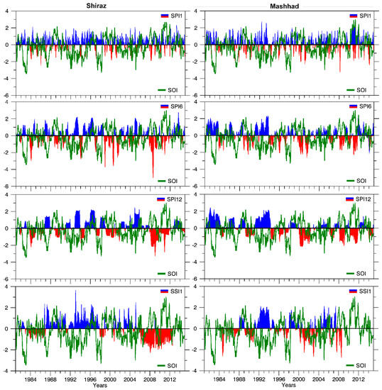 Temporal variations of 1-month, 6-month, and 12-month SPI and SSI with the variations of SOI in the Shiraz and Mashhad boxes. Negative SPI and SSI values—drought conditions in red, positive SPI and SSI values—wet conditions in blue and SOI variations in green color.