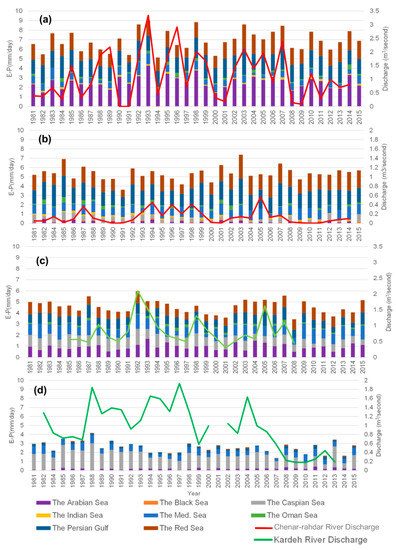 The temporal variations of moisture uptake rate from marine sources and Chenar-rahdar River discharges in the Shiraz box and Kardeh River discharges in the Mashhad box have been shown in Figure 8. During the wet period, the discharge variations of both rivers often follow the same trend as the total moisture uptake rate (E − P) > 0 (Figure 8a,c). This is because the discharges of both Chenar-rahdar River in the Shiraz box (Figure 8a) and Kardeh River (Figure 8c) in the Mashhad box are dominantly supplied by precipitation originating from the mentioned marine moisture sources. During the dry period, moisture sources (E − P) > 0 do not show the same trend as the discharges of Chenar-rahdar and Kardeh rivers (Figure 8b,d) respectively and cannot lead to precipitation due to the intense atmospheric stability caused by Azores subtropical high-pressure system which prevents precipitation. Chenar-rahdar and Kardeh rivers are mainly supplied by groundwater base flow and to a lower extent by infrequent precipitation events during the dry period.