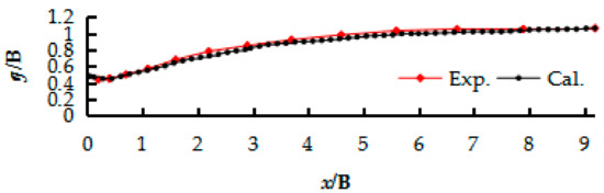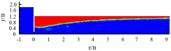 The calculation length after the lift gate is 920 mm and width B of the flume is 100 mm. The computation results of the time-averaged surface profiles with the whole flow passage of the modeling after the gate in
