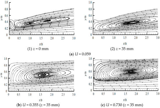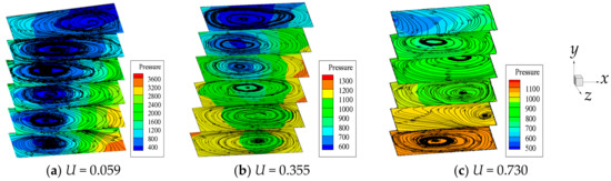U = 0.355 still exists, but the center of the vortex is shifted to the upstream from the bottom to the top, and the center pressure of the bottom vortex is relatively large. For