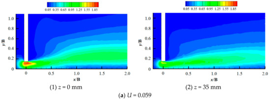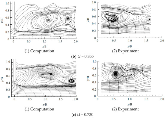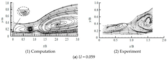 U = 0.059, the numerical simulation captures the phenomenon of the vortex detachment from the gate’s bottom edge, but there is no such phenomenon when