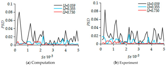 −3 in corresponding cases. The Strouhal number difference for main frequency of the pressure between the computational and the experimental results is very small.