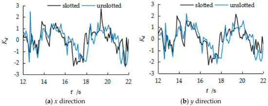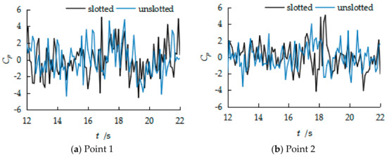 Figure 11 shows the time history curve of the slotted and unslotted pressure pulsating coefficients in