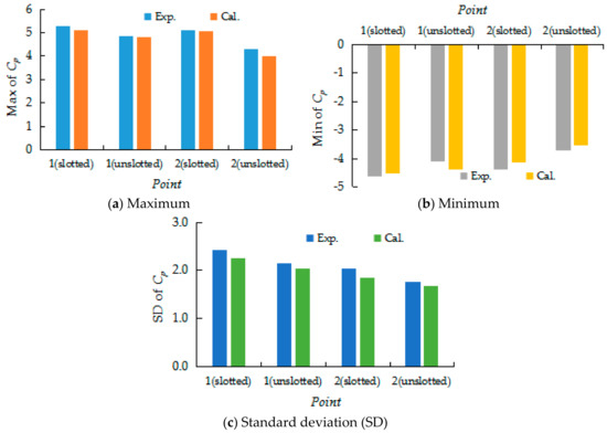 U = 0.059. It can be found that the maximum values of the slotted pressure pulsation coefficients for both points 1 and 2 were larger than those of the without a slot. The characteristic values of the pressure pulsating coefficients (slotted and unslotted) for both the experiment and for the calculation in