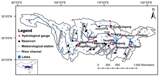 Study area, and locations of hydrological gauges, meteorological stations, and major reservoirs.