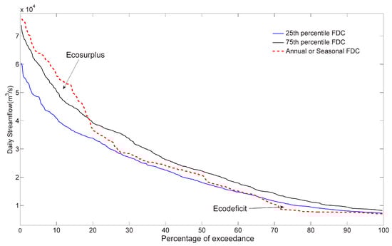 where i is the rank corresponding to flow Qi and n is the total number of days. In the present study, both the annual and seasonal FDCs are estimated for each year to analyze the changes in the flow regime. The eco-flow metrics, including ecosurplus and ecodeficit, are calculated using the FDCs. For each gauge, the FDCs in the natural period are used to obtain the 75th percentile FDC and the 25th percentile FDC. Then, the 75th percentile FDC and the 25th percentile FDC are considered the upper and lower bounds of the adaptive range for riverine ecosystems, respectively. If the annual or seasonal FDC of a given year is located above the 75th percentile FDC, the area between the 75th percentile FDC and the annual or seasonal FDC is defined as ecosurplus []. Conversely, when the annual or seasonal FDC is below the 25th percentile FDC, the area between the 25th percentile FDC and the annual or seasonal FDC is defined as the ecodeficit (Figure 2). The values of the ecosurplus and ecodeficit are divided by the annual mean or seasonal mean flow to make them dimensionless. Thus, this method makes the eco-flow metrics comparable across different gauges. The ecosurplus represents the amount of streamflow that exceeds the ecosystem requirement and the ecodeficit represents the amount of water lacking in the riverine ecosystem [].