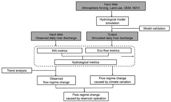 For each gauge, the data series was divided into two stages: a pre-dam period and a post-dam period. The pre-dam period was from 1961 to the year after which the major reservoirs located upstream of the gauge began operating (Table 2). In the pre-dam period, the streamflow was not affected by dam activities. The post-dam period was from the year in which the major reservoirs started operation to 2014 (Table 2). Therefore, the streamflow in the post-dam period may be affected by dam activities. The model simulation represents the natural flow regime without consideration of reservoir operation. Therefore, the changes in the hydrological metric parameters caused by climate variation between the pre-dam and post-dam periods can be calculated as follows: