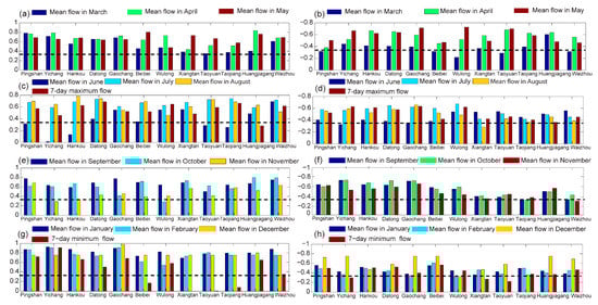 Correlation between the eco-flow metrics and the parameters of groups 1 and group 2 of the IHA metrics: (a) Correlation between the spring ecosurplus and the mean flow in March, April and May; (b) Correlation between the spring ecodeficit and the mean flow in March, April, and May; (c) Correlation between the summer ecosurplus and the mean flow in June, April, and May and the seven-day maximum flow; (d) Correlation between the summer ecodeficit and the mean flow in June, April and May and the seven-day maximum flow; (e) Correlation between the autumn ecosurplus and the mean flow in September, October, and November; (f) Correlation between the autumn ecodeficit and the mean flow in September, October, and November; (g) Correlation between the winter ecosurplus and the mean flow in January, February, and December and the seven-day minimum flow; (h) Correlation between the winter ecodeficit and the mean flow in January, February and December and the seven-day minimum flow. The dashed line is the threshold corresponding to the significance level (p = 0.05).