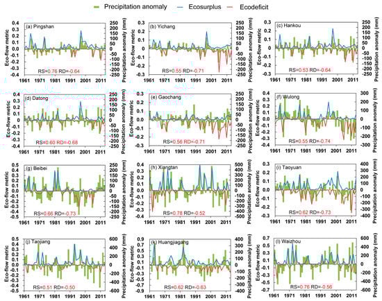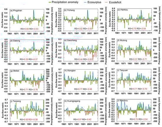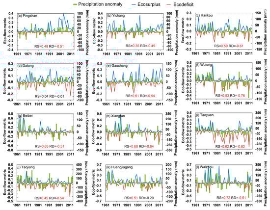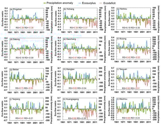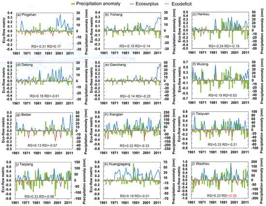 Changes in the annual eco-flow metrics (the ecodeficit was multiplied by −1) at the: (a) Pingshan gauge; (b) Yichang gauge; (c) Hankou gauge; (d) Datong gauge; (e) Gaochang gauge; (f) Wulong gauge; (g) Beibei gauge; (h) Xiangtan gauge; (i) Taoyuan gauge; (j) Taojiang gauge; (k) Huangjiagang gauge; and (l) Waizhou gauge. RS represents the correlation between the ecosurplus and precipitation. RD represents the correlation between the ecodeficit and precipitation. The numbers in red indicate that the correlation is significant (p = 0.05).