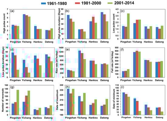 Changes in the parameters of group 2 at the gauges located on the main channel: (a) High pulse count; (b) high pulse duration; (c) low pulse count; (d) low pulse duration; (e) rise rate; (f) fall rate; (g) number of reversals; (h) date of annual maximum flow; and (i) date of annual minimum flow.