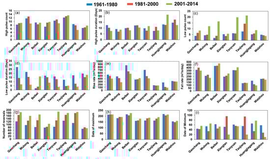 Changes in the parameters of group 2 at the gauges located on the tributaries: (a) High pulse count; (b) high pulse duration; (c) low pulse count; (d) low pulse duration; (e) rise rate; (f) Fall rate; (g) number of reversals; (h) date of annual maximum flow; and (i) date of annual minimum flow.