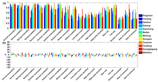 where ∆Hclimate is the change in the parameters caused by climate variation. Hsim,post and Hsim,pre are the mean values of the parameters of the hydrological metrics calculated by model simulation in the post-dam period and pre-dam period, respectively.