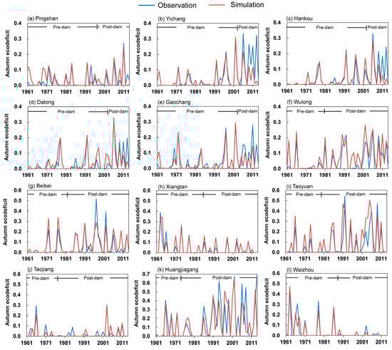 Changes in the autumn ecodeficit calculated by observation and model simulation in the pre- and post-dam periods at the: (a) Pingshan gauge; (b) Yichang gauge; (c) Hankou gauge; (d) Datong gauge; (e) Gaochang gauge; (f) Wulong gauge; (g) Beibei gauge; (h) Xiangtan gauge; (i) Taoyuan gauge; (j) Taojiang gauge; (k) Huangjiagang gauge; and (l) Waizhou gauge.