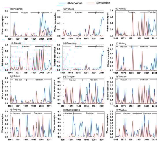 Changes in the winter ecosurplus calculated by observation and model simulation in the pre- and post-dam periods at the: (a) Pingshan gauge; (b) Yichang gauge; (c) Hankou gauge; (d) Datong gauge; (e) Gaochang gauge; (f) Wulong gauge; (g) Beibei gauge; (h) Xiangtan gauge; (i) Taoyuan gauge; (j) Taojiang gauge; (k) Huangjiagang gauge; and (l) Waizhou gauge.