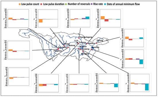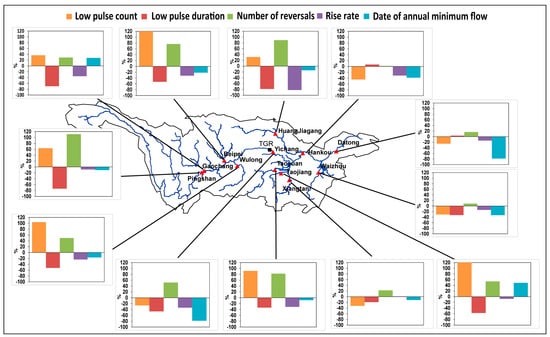 Relative changes in hydrological parameters caused by reservoir operation between the post and pre-dam periods at all gauges.