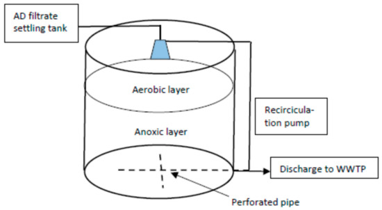 Influent to both the barrel and Baker tank reactors was obtained from 3.4 m3 (1000 gal) and 30 m3 (8000 gal) AD filtrate storage-settling tanks, respectively. Both reactors were designed as recirculating trickling-filter reactors and operated as two-layer aerobic-anaerobic treatment systems to take advantage of the nitritation-anammox process described by Zekker et al. [12] and the oxycline described in our review (Grismer and Collison [7]). In effect, the two-layer zeolite-anammox system within a single reactor enables the top layer to produce nitrite (equivalent to the Sharon process in a separate tank) while, presumably, a combination of denitrifying and anammox bacteria in the lower submerged layer converts nitrite and ammonia to nitrogen gas.