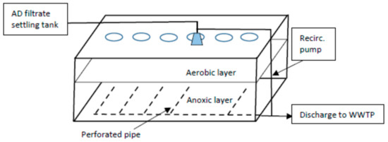 Following the proof-of-concept study using the barrel reactors, we built an intermediate-scale Baker tank reactor designed to treat approximately 41.6 m3/day (11,000 gal/day) of the AD filtrate. As schematically illustrated in Figure 2, the Baker tank reactor was approximately 9 m long by 2.5 m wide by 3.0 m deep and filled with the same 20-mm zeolite aggregate used in the barrel reactors through six access holes created at the top of the container. Without aggregate settling as in the barrels, we estimated that there was a smaller aggregate bulk density of ~850 kg/m3 in the Baker tank. A movable sprayer assembly operated over the top of the aggregates, and like the barrel reactors, a recirculation pump enabled control of the water level in the tank to create an aerobic trickling-filter type top meter layer and a submerged anaerobic layer about 2 m thick (~45 m3). Automated control valves at the inlet, outlet, and pump enabled daily cyclic inflow and recirculation resulting in a design hydraulic retention time of 21–22 h. The Baker tank experiments included two sequential operational stages during a 15-month period from July 2014 to October 2015. During the July 2014 to March 2015 first stage, the Baker tank reactor operated as a trickling-filter similar to that used in the barrel study prior to significant aggregate clogging. Clogging and fluctuating tank water levels affected the second stage performance period of the Baker tank, but provided insight into the aeration effects on the zeolite-anammox system performance.