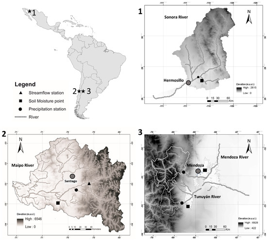 Maps of selected river basins: (1): Sonora, (2): Maipo, and (3): Mendoza-Tunuyán.